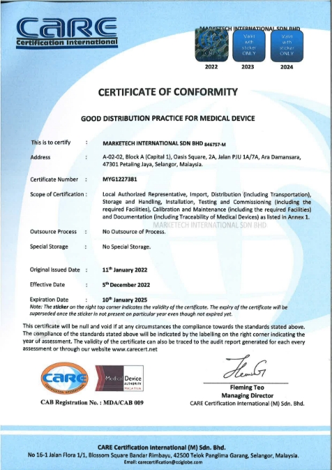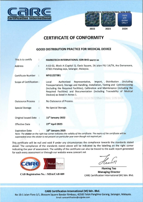 Our certification proudly reflects our commitment to excellence in two vital sectors, which CIDB for our construction business and CARE for our medical devices: